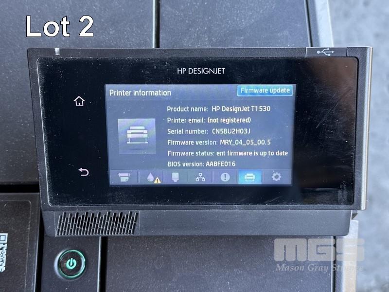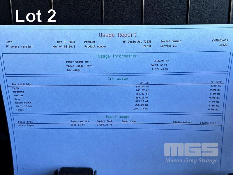 LARGE FORMAT PRINTER, HP DESIGNJET T1530, L2Y23A, 36", 3,186m2 PAPER USAGE (TEST PAGE ATTACHED) WITH SPARE PAPER ROLLS (NOTE: MESSAGE PRINTHEAD NEARING END OF LIFE, CARTRIDGES EXPIRED, NO MEDIA BIN) S/N:CN5BU2H03J