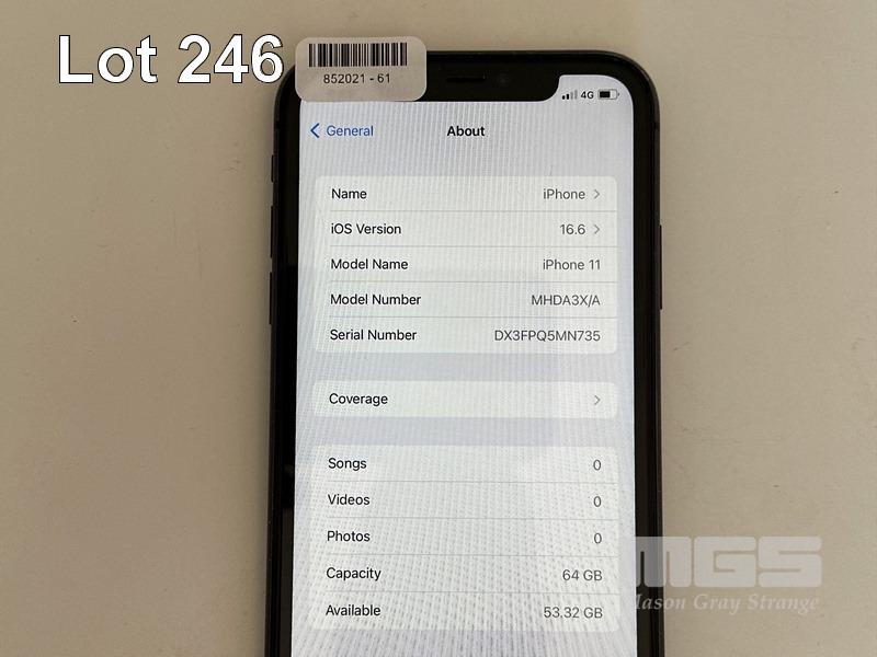 APPLE iPHONE 11, 64GB, BLACK, MODEL MHDA3X/A (NO CHARGER, NO CABLE) (NOTE: SCRATCHES ON SCREEN) S/N:DX3FPQ5MN735
