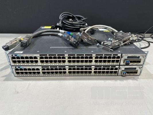 2 x CISCO CATALYST 3750-X SERIES 48-PORT SWITCHES, WS-C3750X-48P-S V04 EACH WITH C3KX-NM-1G NETWORK MODULE, STACK CABLES & IEC-C15 NOTCH POWER CABLES S/N:FDO1649Z2GT, FDO1649Z2DB