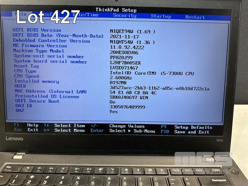 LAPTOP, LENOVO THINKPAD T470, TYPE 20HE, CORE i5 7300U (7TH GEN) @ 2.6GHz, 8GB DDR4 RAM, 256GB NVMe M.2 SSD, 14" WIDESCREEN (1920x1080), INTEL HD VIDEO, Wi-Fi, BLUETOOTH, WINDOWS 10 PRO INSTALLED & POWER SUPPLY (NOTE: MARKS ON SCREEN) S/N:PF0Z0J99