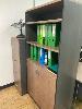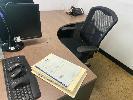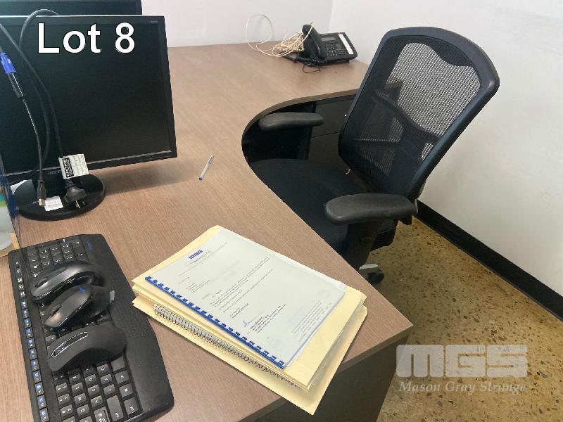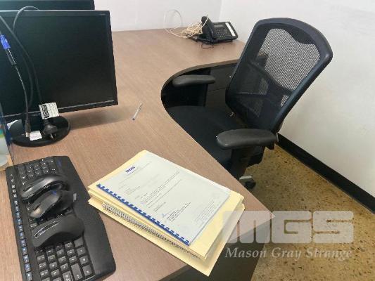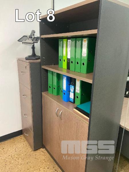 CONTENTS OF OFFICE INCLUDING TIMBER LAMINATE DESK & RETURN, 1800 x 1800mm, OFFICE CHAIR, 2 DOOR CUPBOARD & SHELF UNIT WITH CONTENTS, 4 DRAWER FILING CABINET, 2 x VISITORS CHAIRS & WALL PRINT