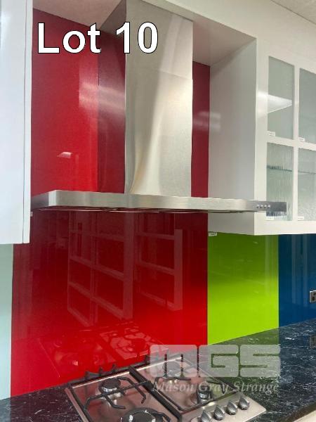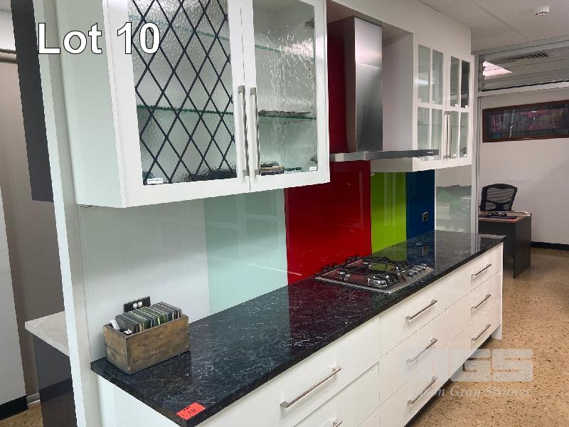 DISPLAY KITCHEN SET INCLUDING 2 x OVERHEAD GLASS 2 DOOR CUPBOARDS, STAINLESS STEEL RANGEHOOD, 4 BURNER GAS COOKTOP & 9 DRAWER BENCH UNIT, 3225 (L) x 600 (D) x 900mm (H) *** BUYER TO REMOVE ***