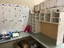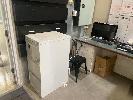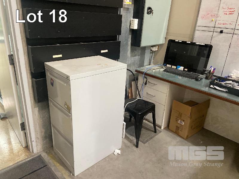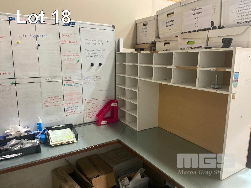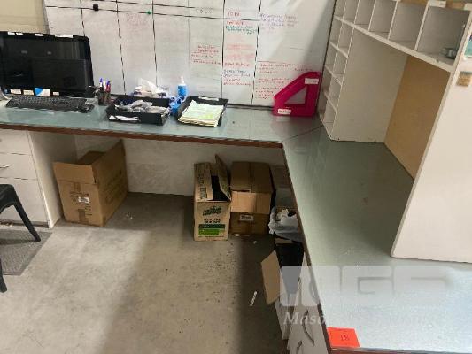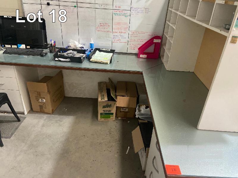 TIMBER LAMINATE DESK & RETURN, GLASS TOP, 3 DRAWER SET, 2600 x 1900mm, CHAIR & 16 PIGEON HOLE UNIT & 3 DRAWER STEEL FILING CABINET
