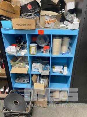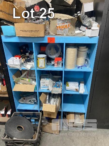 BLUE STORAGE RACK & CONTENTS INCLUDING HARDWARE, GLASS SHOWER SHELVES & BATHROOM ACCESSORIES