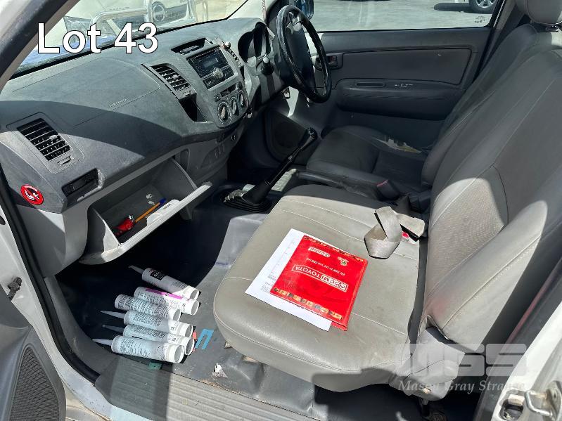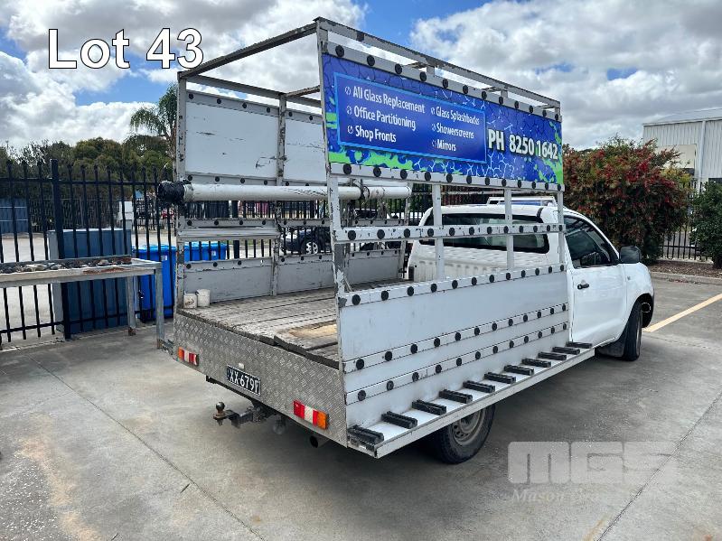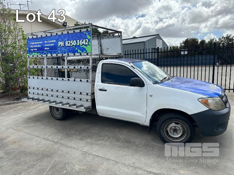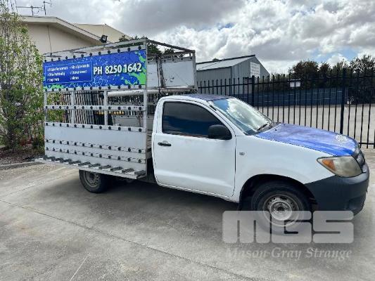 2008 TOYOTA HILUX REG: XX 679F VIN: MR0CX12G900032598 ODO: 276,495kms SHOWING 2TRFE 2.7 LITRE PETROL, 5 SPEED MANUAL TRANSMISSION, TOW BAR, DOUBLE SIDED GLASS RACK 2400 (L) x 1850mm (H) TIMBER TRAY (WITH PAPERS, WITH 1 KEY/S, WITH OWNER'S MANUAL, WITH SERVICE BOOKS) CONDITION: DUCO - SCRATCHES