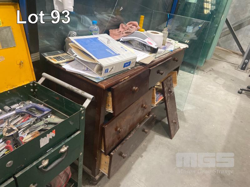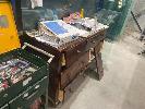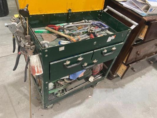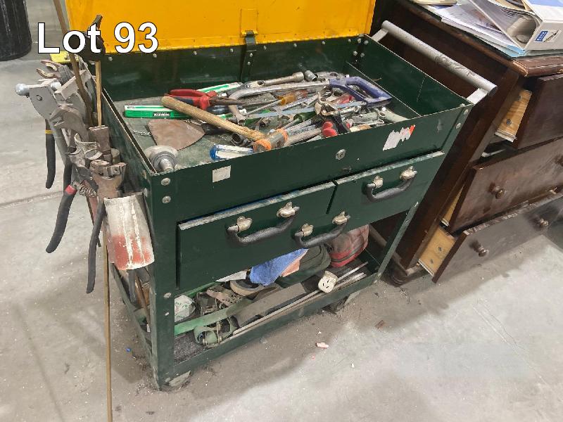 TOOL TROLLEY & CONTENTS HACKSAW, PLIERS, GLASS TOOLS, ETC & TIMBER CABINET