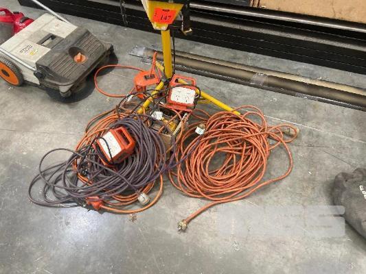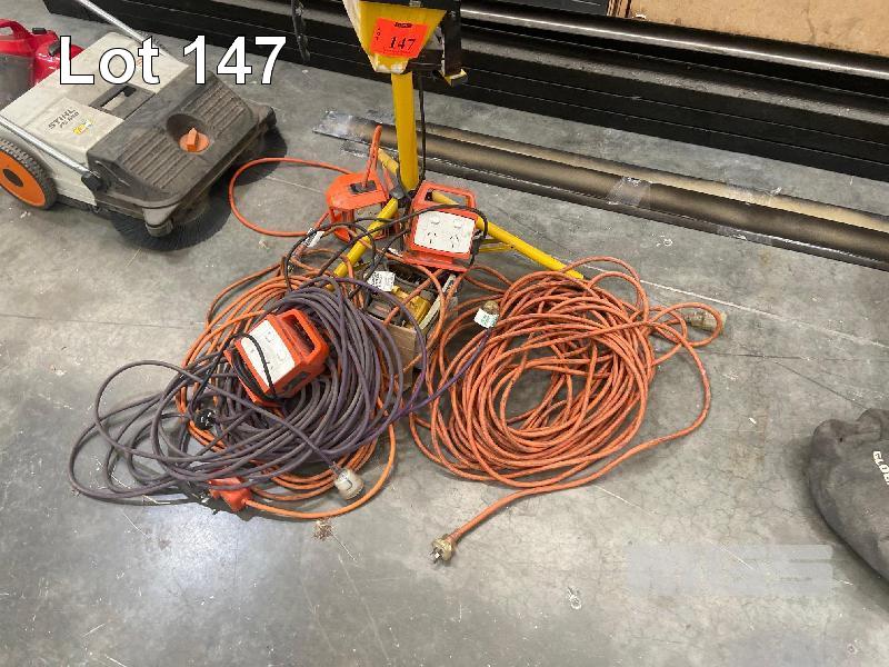 3 x HALOGEN FLOODLIGHTS, 3 x EXTENSION CORDS & 3 x PORTABLE GPO'S WITH ELCB