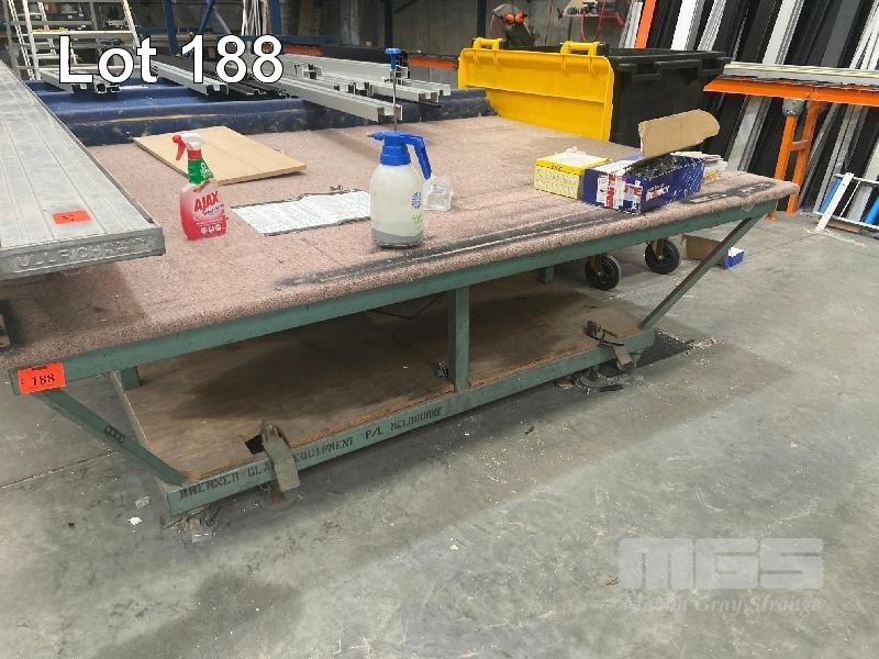 GLAZIERS WORK TABLE, MOBILE, STEEL FRAME, CARPETED TOP 2400 (L) x 1730 (W) x 770mm (H)