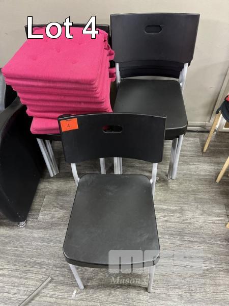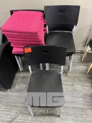 10 x STACKABLE CAFE CHAIRS, BLACK PLASTIC, STEEL FRAME, WITH CUSHIONS