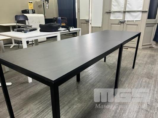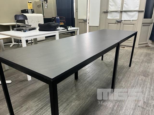2 x BLACK TIMBER LAMINATE TABLES, BLACK STEEL FRAME, 1100 x 670mm