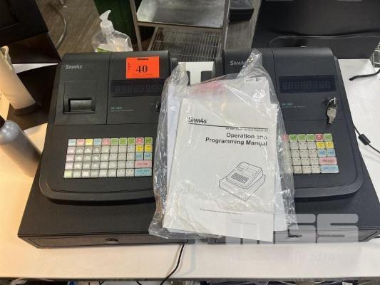 2 x SAM4S CASH REGISTERS, MODEL: ER-180T & MOBILE TIMBER LAMINATE COUNTER, 1400 x 600 x 600mm (H), LOCKABLE WHEELS