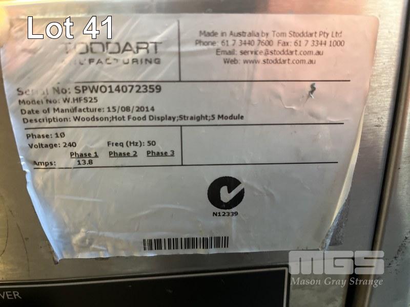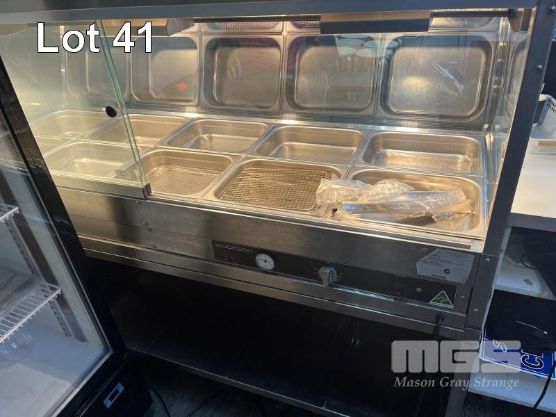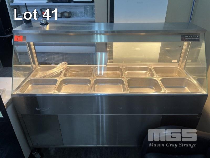 WOODSON MOBILE BAIN MARIE, GLASS FRONT WITH GLASS SLIDING DOORS, 3 x HEAT LAMPS, MODEL: W.HFS25, DOM: 2014, 1670 x 600mm, 240v 15A PLUG PLUS 15A EXTENSION CORD
