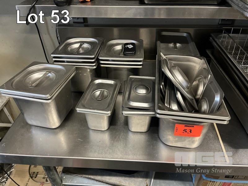 32 x ASSORTED STAINLESS STEEL GASTRONORM TRAYS, SOME WITH LIDS, PLUS ASSORTED STAINLESS STEEL DRYING RACKS