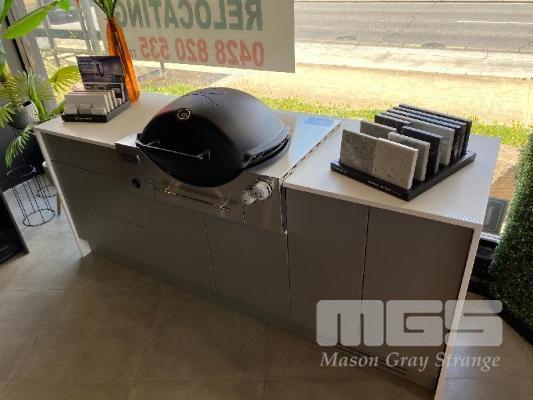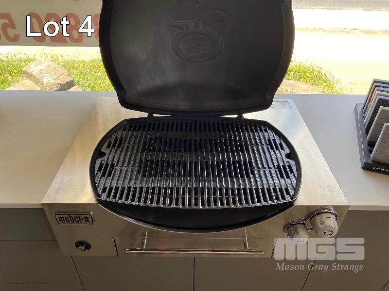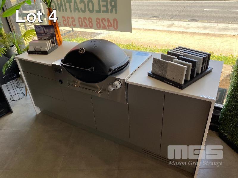 CAESAR STONE OUTDOOR KITCHEN SET CAESAR STONE COUNTER TOPS, COLOUR: MID DAY, 'APPROVED OUTDOOR MATERIAL' WEBBER Q NATURAL GAS BBQ, 2 BURNER, MODEL: Q 3600, STAINLESS STEEL SURROUND, WITH BOOKLET 4 x DOOR, 3 x DOOR UNDER BENCH STORAGE