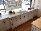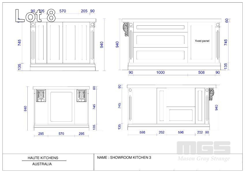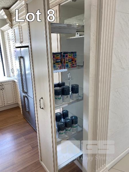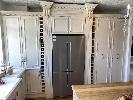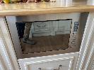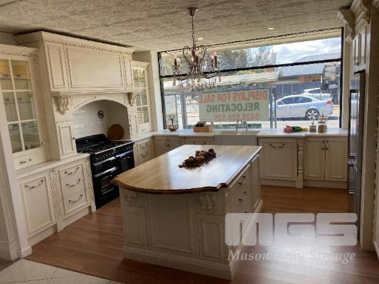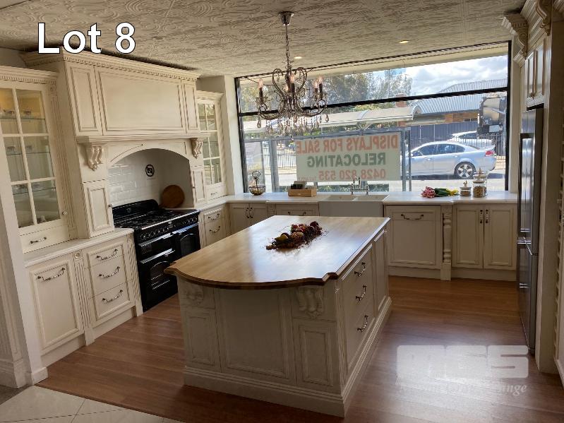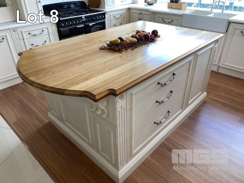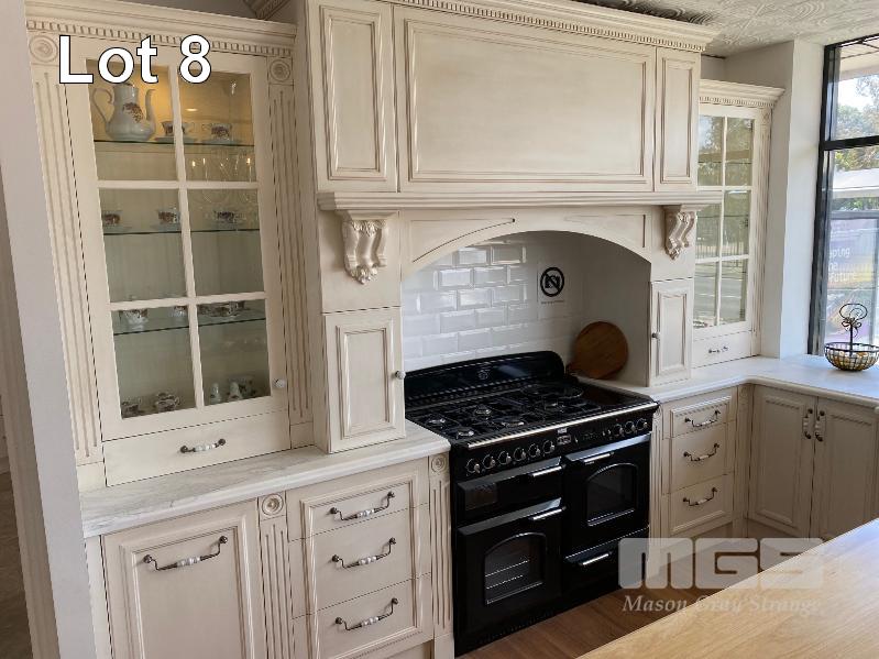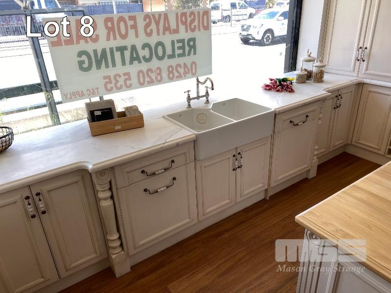 FRENCH PROVINCIAL SHOW ROOM KITCHEN CALCUTTA WHITE MARBLE COUNTER TOPS, LAMBS TONGUE EDGE PROFILE TIMBER TOP KITCHEN ISLAND 12 x UNDER BENCH DRAWERS, 8 x STORAGE CUPBOARDS, SLIDE OUT PANTRY 1901 FIRECLAY TWIN BOWL SINK WITH CHROME TAP SMEG INVERTER MICROWAVE WITH CONVECTION, 1300w MODEL: SBIN30X, 240v HOME APPLIANCES BUILT IN DISHWASHER, MODEL: FI14BM, 240v FALCON UNDER MOUNT STAINLESS STEEL RANGE HOOD, MODEL: FALUC75, 240v (FALCON OVEN & SMEG FRIDGE NOT INCLUDED)