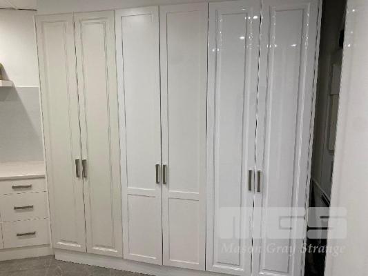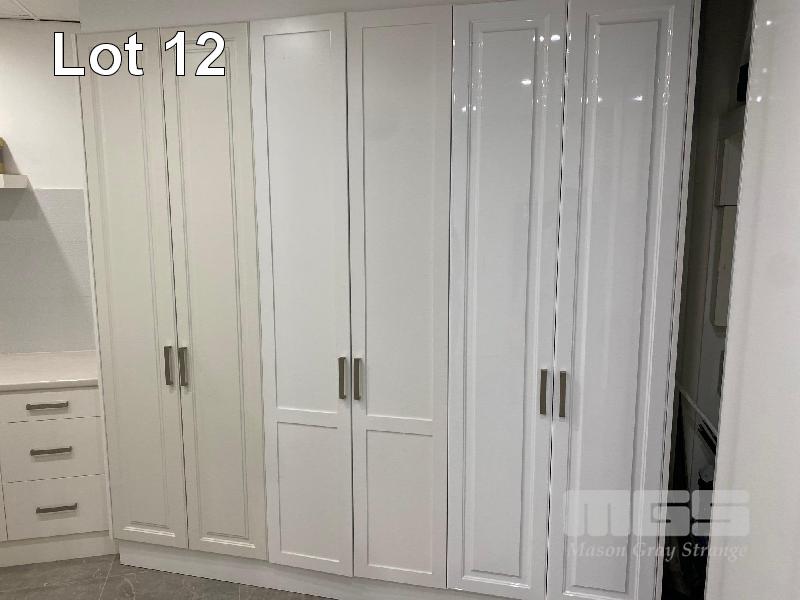 6 DOOR BUILT IN WARDROBE, TIMBER LAMINATE, CHROME HANDLES, 2440 x 2400 x 600mm (D) (DOORS NOT MATCHING)
