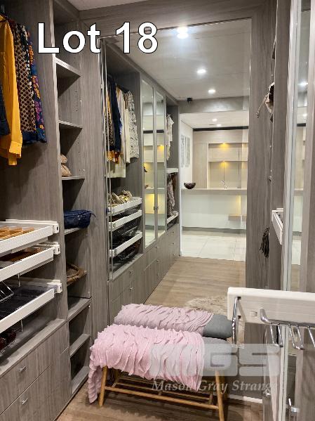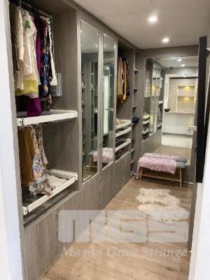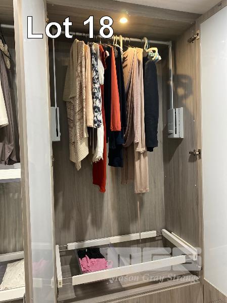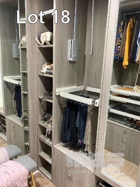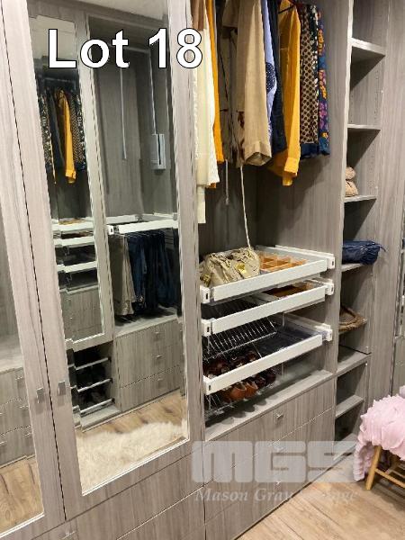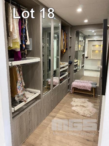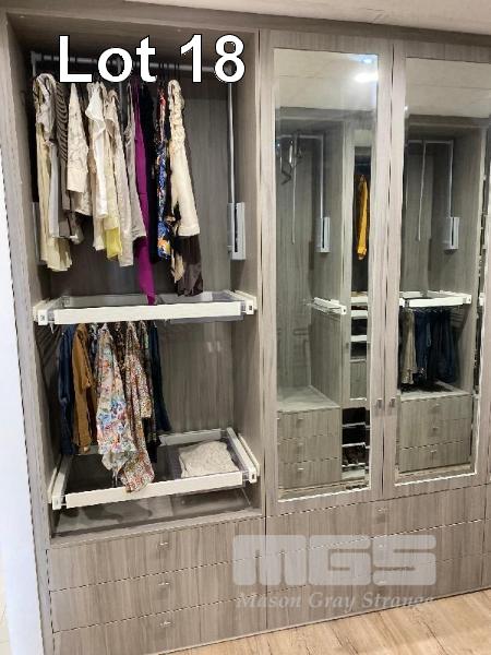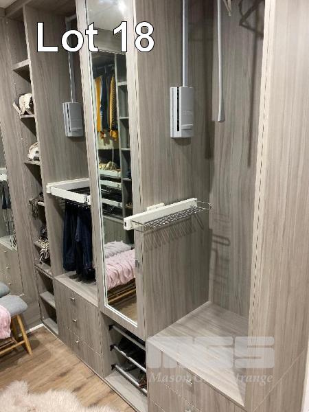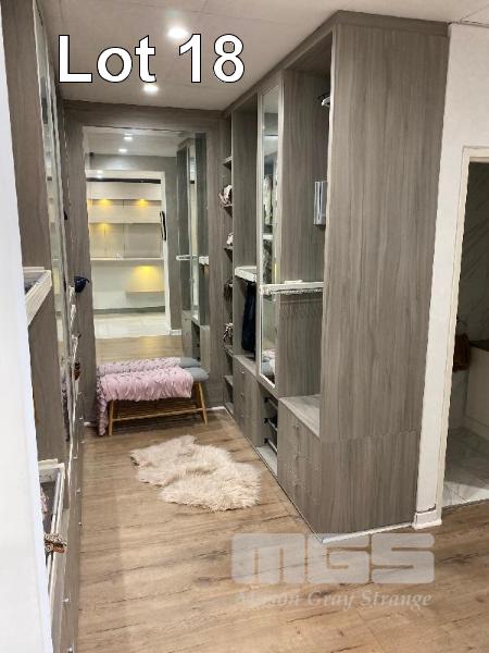 DISPLAY WALK IN WARDROBE BUILT IN WARDROBE 1: 3340 (W) x 2640 (H) x 570mm (D) 3 x STORAGE SECTIONS, 9 x DRAWERS, PULL DOWN CLOTHES HANGERS, SLIDE OUT CLOTHES STORAGE BUILT IN WARDROBE 2: 2130 (W) x 2640 (H) x 570mm (D) 2 x STORAGE SECTIONS, 6 x DRAWERS, PULL DOWN CLOTHES HANGERS, SLIDE OUT CLOTHES STORAGE BEVEL EDGE WALL MOUNT MIRROR, 2100 x 1000mm