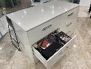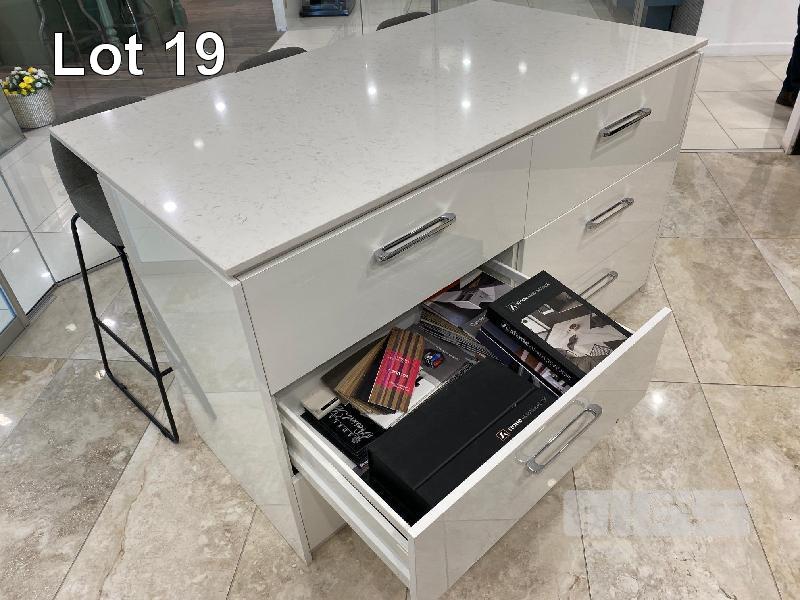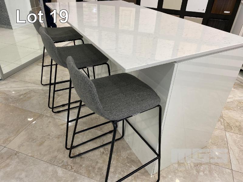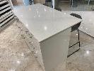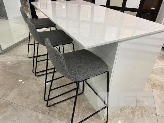 WHITE CAESAR STONE KITCHEN ISLAND, 1650 x 900 x 20mm 6 x STORAGE DRAWERS, 3 x GREY CLOTH BAR STOOLS