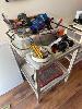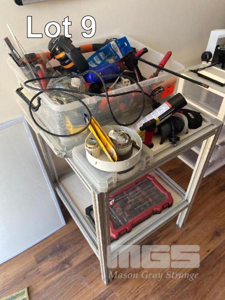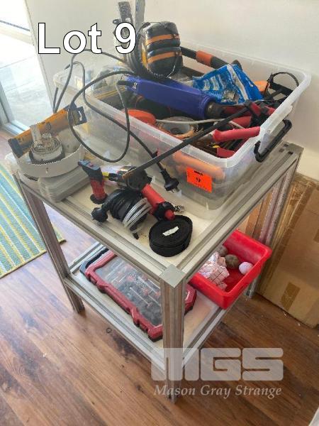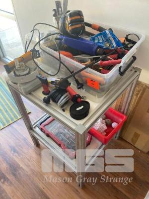 HEAT GUN, SCREWDRIVER SET, CLAMPS, HOLE SAWS, RING OF SPANNER ASSORTED TOOLS & 2 TIER STAND