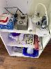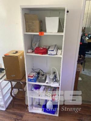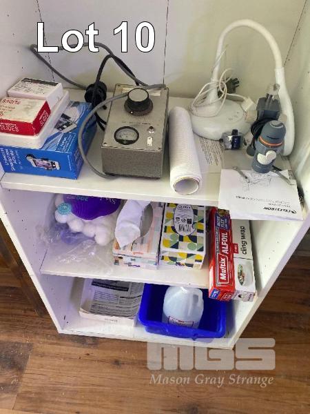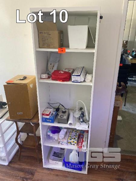 WHITE MODULAR STAND, 5 TIER & CONTENTS SYRINGES, SAFETY KIT, VARIABLE VOLTAGE SUPPLY & ASSORTED CLEANING PRODUCTS