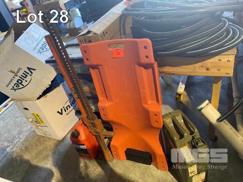 FUEL DRUM, RED, 10 LITRE, QUICK ACTION 4WD JACK, 20 LITRE STEEL JERRY CAN & MECHANICS CREEPER