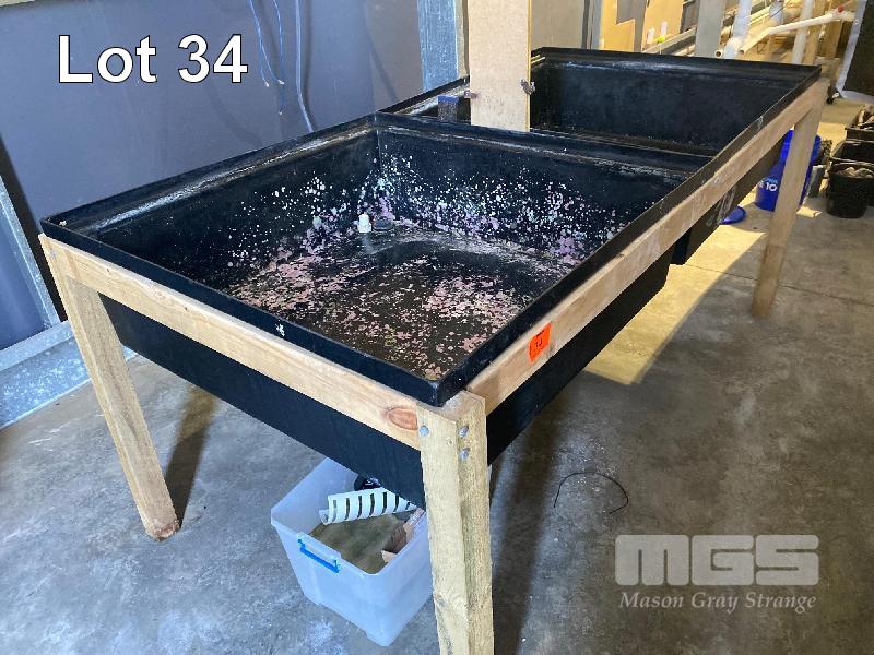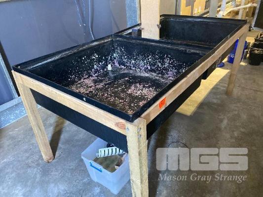 2 x BLACK POLY TANKS, 1170 x 1170 x 300mm (D) & TIMBER STAND