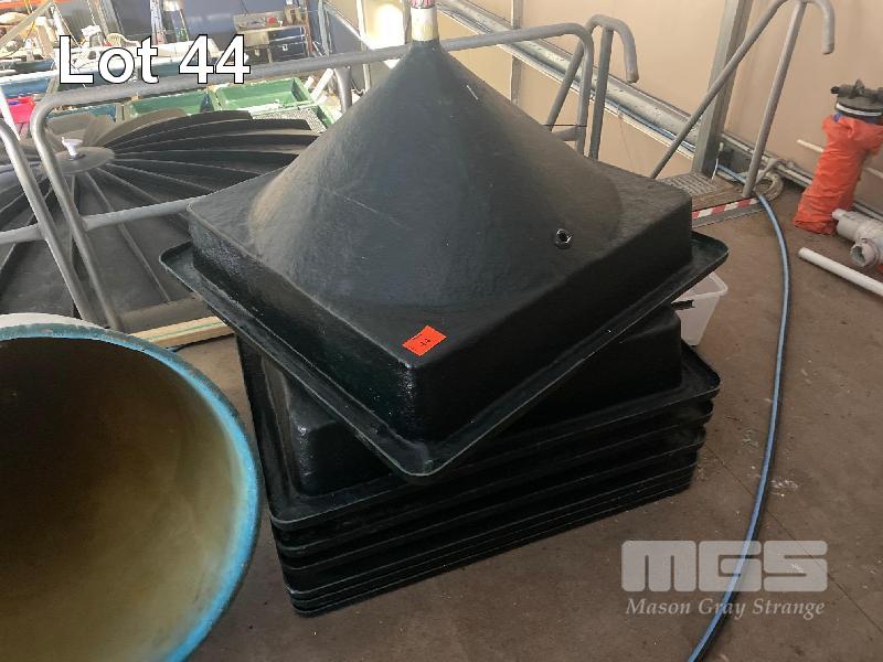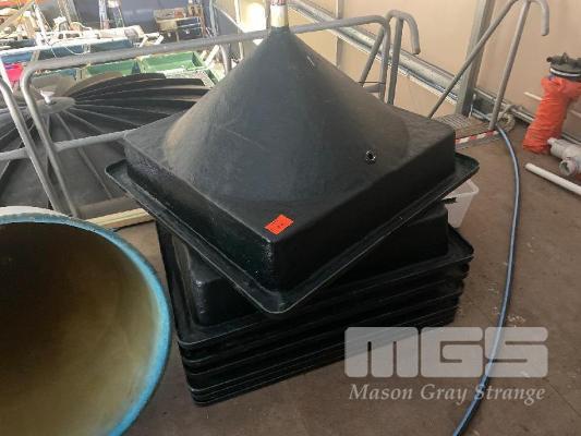 7 x FIBREGLASS CONE BOTTOM TANKS, 1100 x 1100mm, CENTRE DRAIN