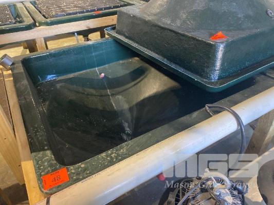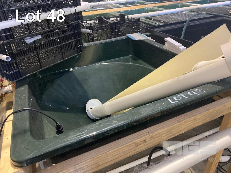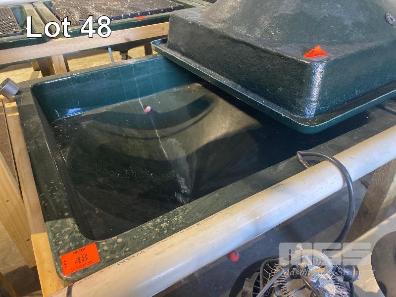 2 x FIBREGLASS TANKS, GREEN, CONE BASE WITH OUTLET TO BASE 1100 x 1100mm WITH PLASTIC GRID