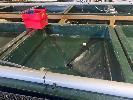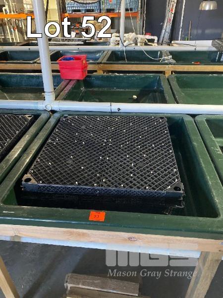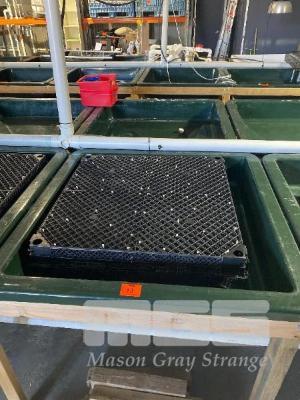 2 x FIBREGLASS TANKS, GREEN, CONE BASE WITH OUTLET TO BASE 1100 x 1100mm WITH PLASTIC GRID