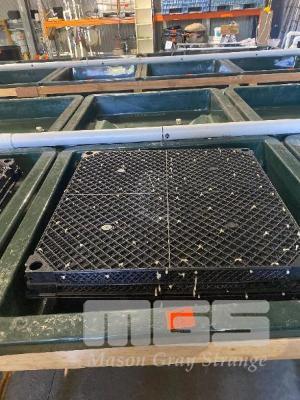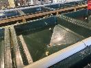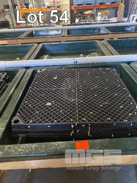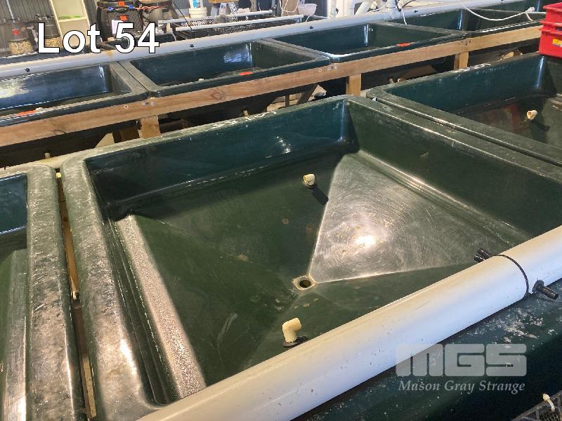 2 x FIBREGLASS TANKS, GREEN, CONE BASE WITH OUTLET TO BASE 1100 x 1100mm WITH PLASTIC GRID