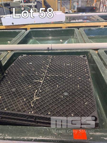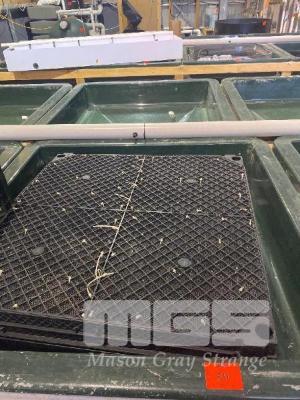 2 x FIBREGLASS TANKS, GREEN, CONE BASE WITH OUTLET TO BASE 1100 x 1100mm WITH PLASTIC GRID