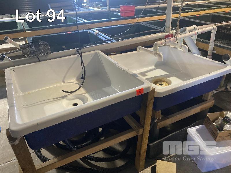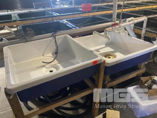 2 x FIBREGLASS TANKS, 1100 x 1100 x 300mm WHITE WITH DRAIN & TIMBER STANDS
