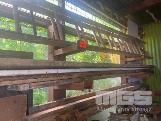 WOODEN EXTENSION LADDER ORNAMENTAL ONLY (NOT RATED, HANG YOUR PLANTS ON IT), TIMBER PLANKS & TRAILER AXLE