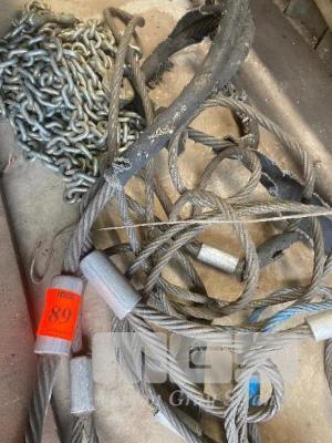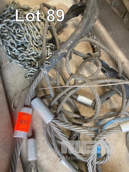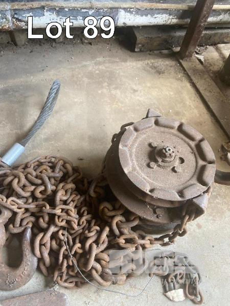 OLD CHAIN HOIST, NOT RATED WIRE ROPE SLINGS & 8mm TIE DOWN CHAIN
