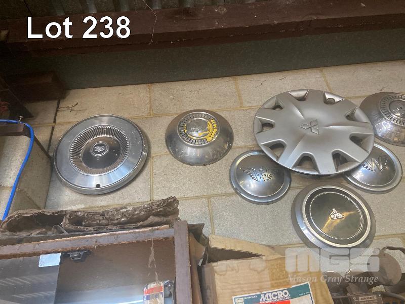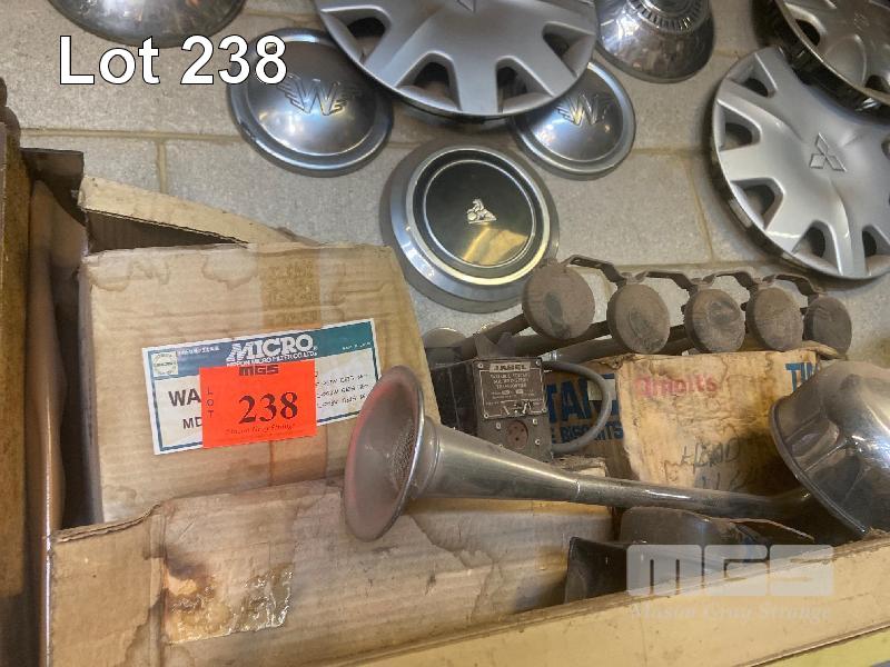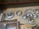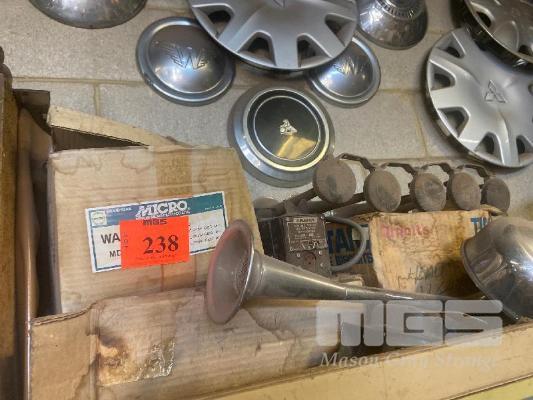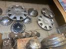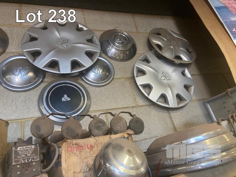 THE WALL LOT INCLUDING, ASSORTED EARLY & LATE HUB CAPS, WHEEL COVERS, HORN, ETC
