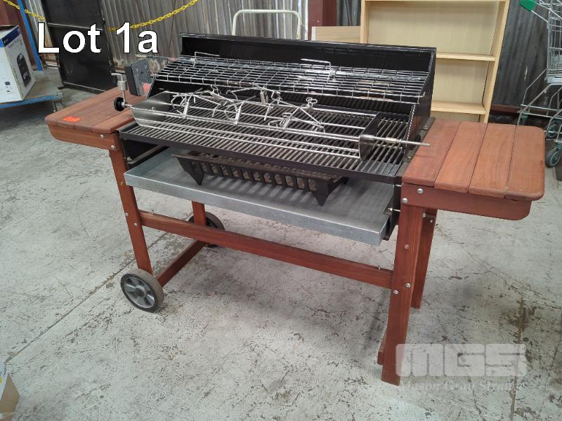 MOBILE CHARCOAL GRILL BBQ, JARRAH TROLLEY, STAINLESS STEEL GRILL, MEAT RESTING SHELF, 240V ROTISSERIE MOTOR, 1095 MM SPIT ROD WITH SKEWER FORKS AND PREMIUM STAINLESS STEEL 28" X 8" ROTISSERIE CRADLE.