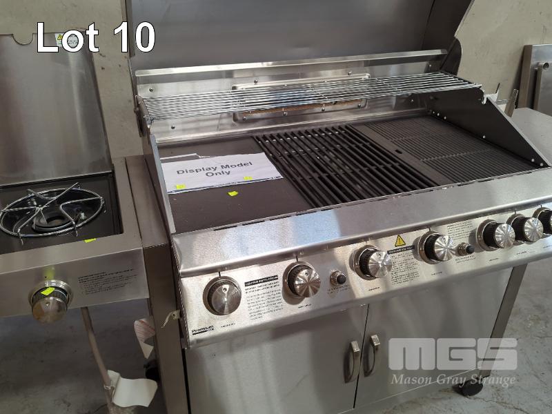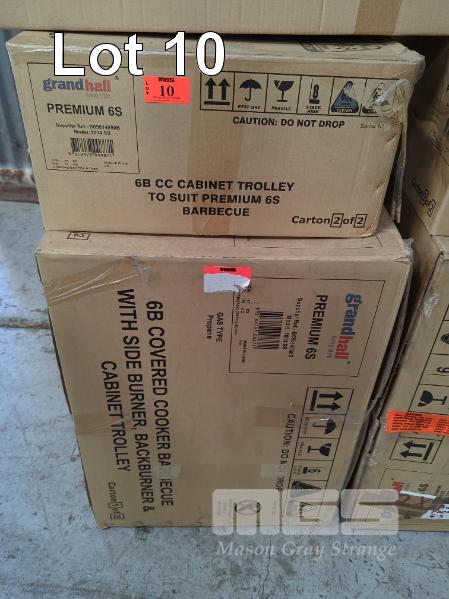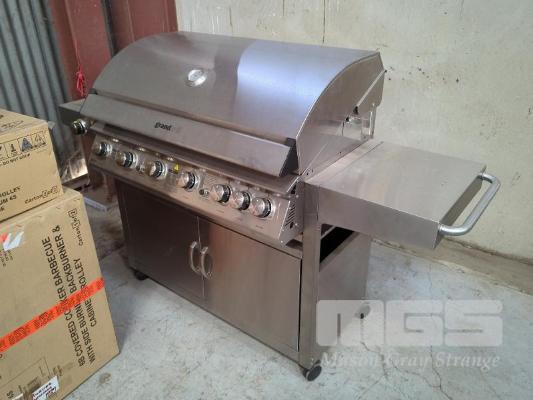 GRANDHALL PREMIUM 6S MOBILE STAINLESS STEEL COVERED GAS BBQ ON CABINET TROLLEY. FEATURES STAINLESS STEEL HOOD, 2-DOOR STAINLESS STEEL CABINET TROLLEY WITH 6-BURNERS PLUS BACK-BURNER, SIDEBURNER AND ELECTRONIC IGNITION. MODEL1004SS.C NEW IN BOX (2 X BOXES). ORP $1,799