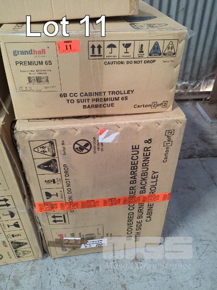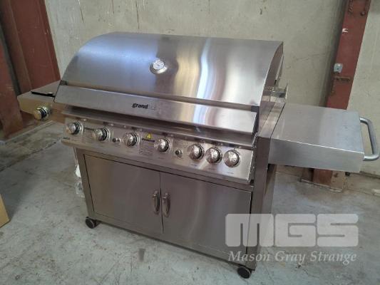 GRANDHALL PREMIUM 6S MOBILE STAINLESS STEEL COVERED GAS BBQ ON CABINET TROLLEY. FEATURES STAINLESS STEEL HOOD, 2-DOOR STAINLESS STEEL CABINET TROLLEY WITH 6-BURNERS PLUS BACK-BURNER, SIDEBURNER AND ELECTRONIC IGNITION. MODEL1004SS.C NEW IN BOX (2 X BOXES). ORP $1,799
