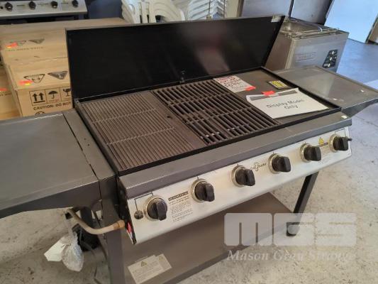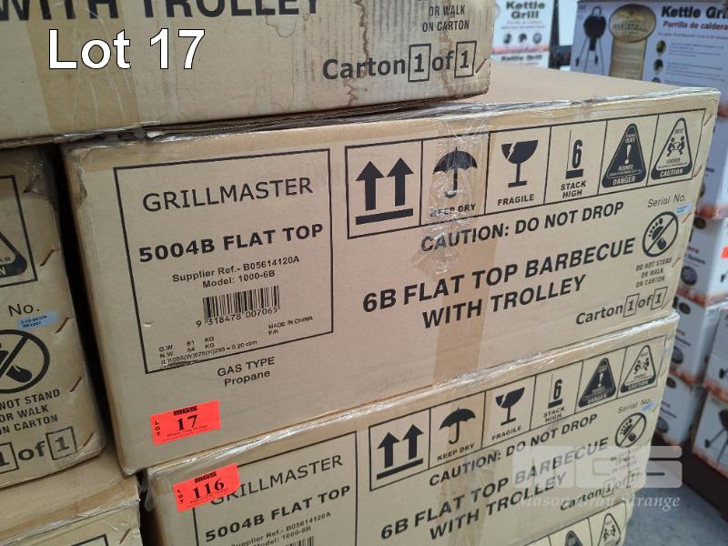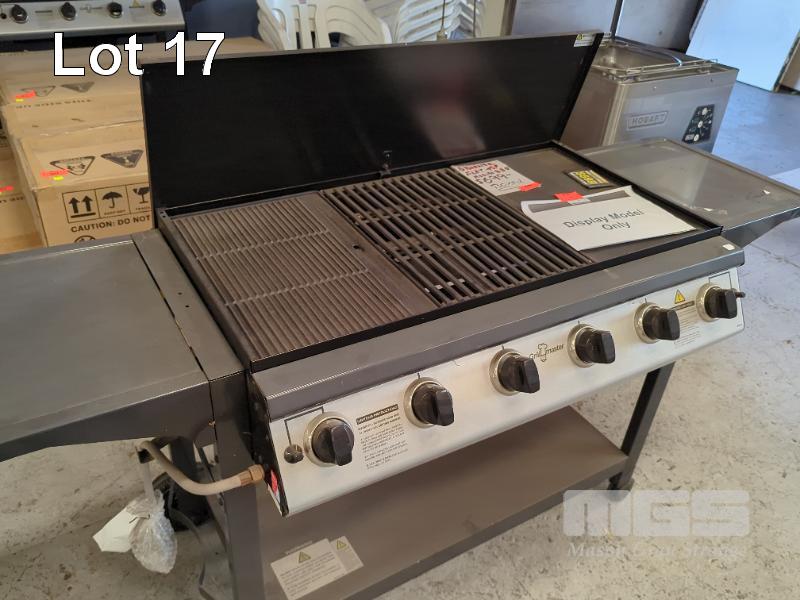 GRILLMASTER MOBILE FLAT TOP GAS BBQ 6-BURNER WITH TROLLEY.