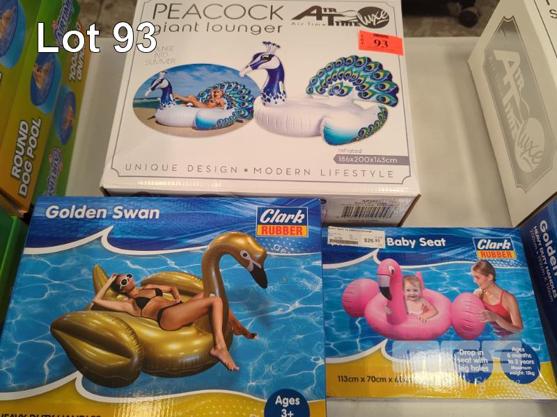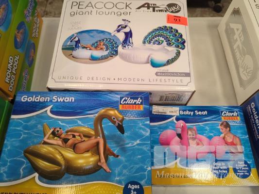 3 X INFLATABLE RIDE-ON WATER PLAY TOYS. GIANT LOUNGER, GOLDEN SWAN AND BABY SEAT (ALL NEW).