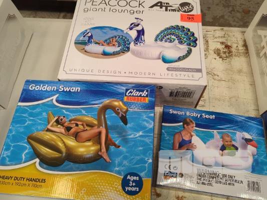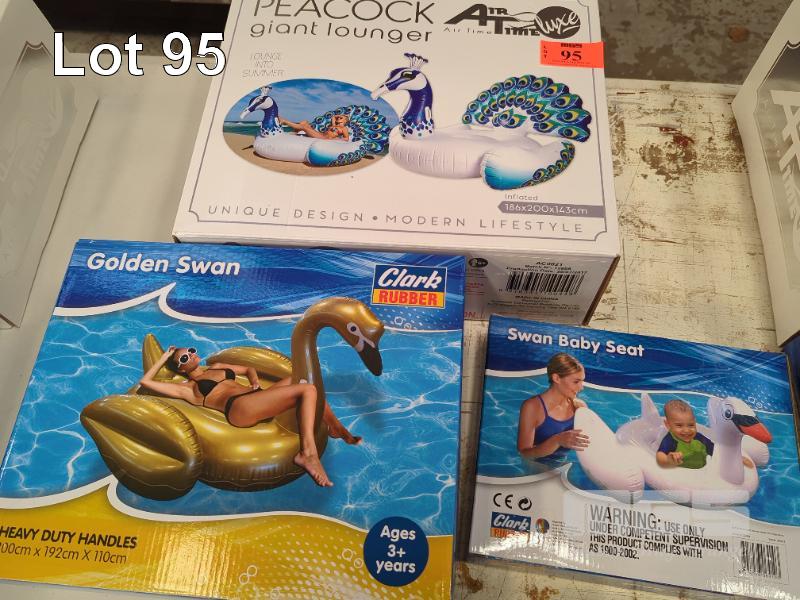 3 X INFLATABLE RIDE-ON WATER PLAY TOYS. GIANT LOUNGER, GOLDEN SWAN AND BABY SEAT (ALL NEW).