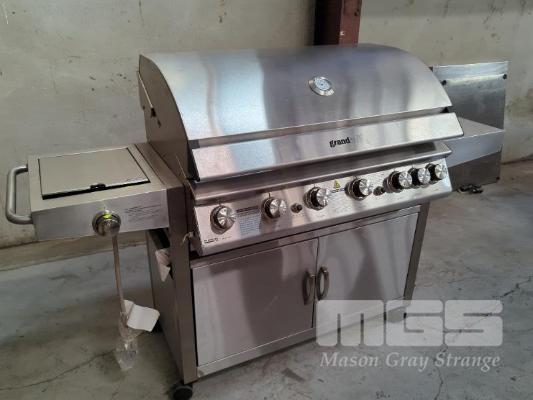 GRANDHALL PREMIUM 6S MOBILE STAINLESS STEEL COVERED GAS BBQ ON CABINET TROLLEY. FEATURES STAINLESS STEEL HOOD, 2-DOOR STAINLESS STEEL CABINET TROLLEY WITH 6-BURNERS PLUS BACK-BURNER, SIDEBURNER AND ELECTRONIC IGNITION. MODEL1004SS.C NEW IN BOX (2 X BOXES). ORP $1,799