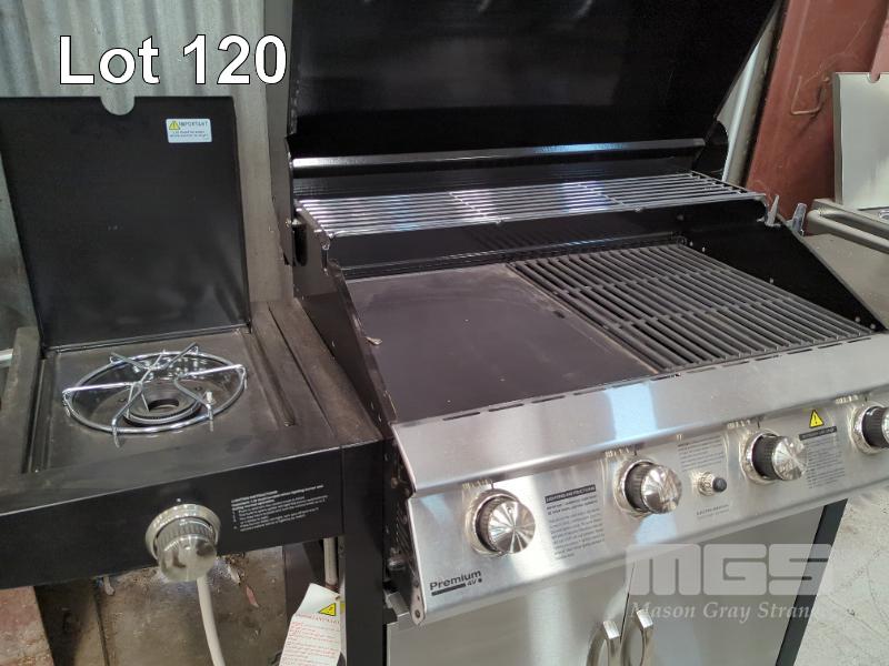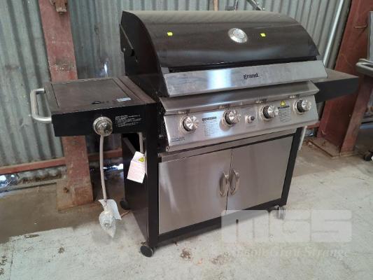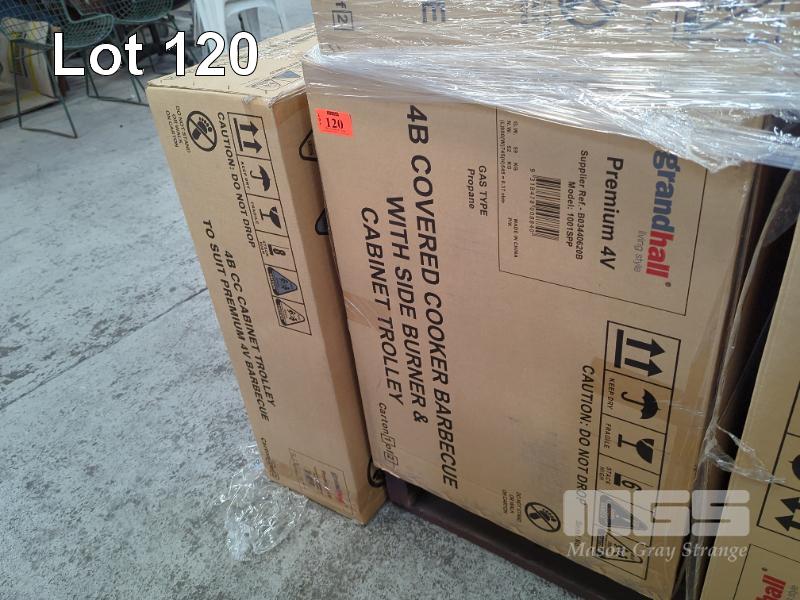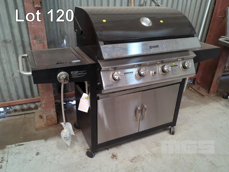 GRANDHALL PREMIUM 4V MOBILE GLOSS BLACK COVERED GAS BBQ ON CABINET TROLLEY. FEATURES MATCHING HOOD & 2-DOOR MATCHING CABINET, 4-BURNERS PLUS SIDEBURNER AND ELECTRONIC IGNITION. MODEL 1001SPP NEW IN BOX (2 x BOXES). ORP $799