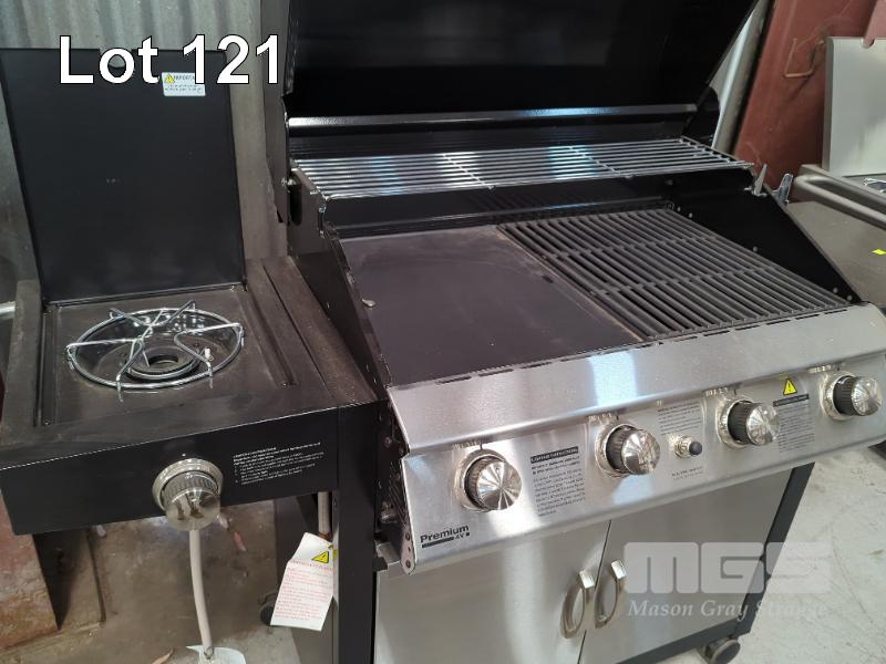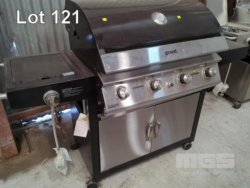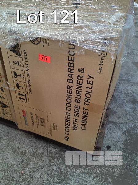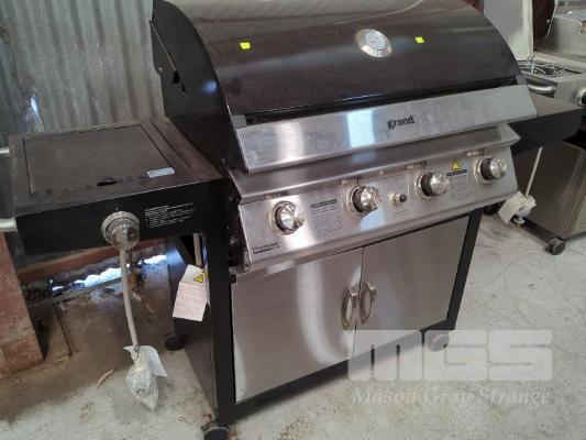 GRANDHALL PREMIUM 4V MOBILE GLOSS BLACK COVERED GAS BBQ ON CABINET TROLLEY. FEATURES MATCHING HOOD & 2-DOOR MATCHING CABINET, 4-BURNERS PLUS SIDEBURNER AND ELECTRONIC IGNITION. MODEL 1001SPP NEW IN BOX (2 x BOXES). ORP $799