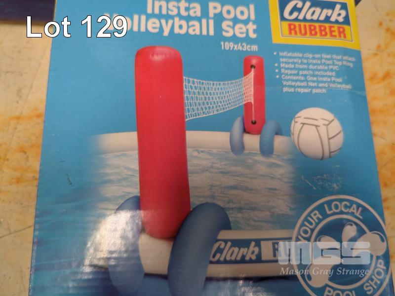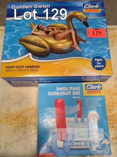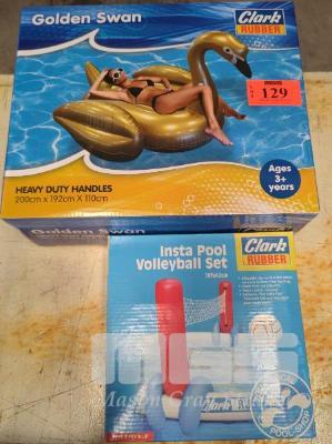 GOLDEN SWAN INFLATABLE RIDE-ON WATER PLAY TOY AND INFLATABLE POOL VOLLEYBALL SET (ALL NEW).