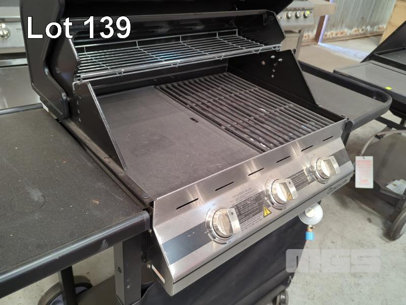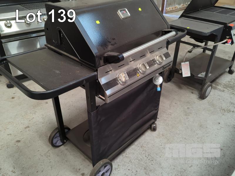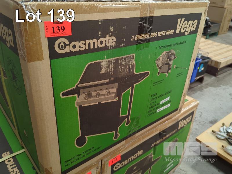 GASMATE VEGA MOBILE 3-BURNER COVERED GAS BBQ ON 2-DOOR CABINET TROLLEY MODEL KLO24D NEW IN BOX. ORP $399