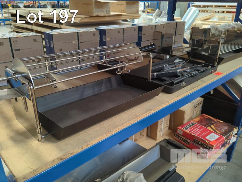 ASSORTED BBQ (1 X SHELF). INCLUDES ROTISSERIE CRADLE & 2 X CHARCOAL GRILLS PLUS COMPONENTS AND UTENSILS KIT.