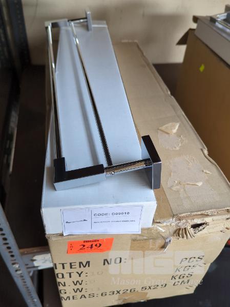 10 x WALL MOUNT DOUBLE TOWEL RAILS, CHROME, WITH FITTINGS. NEW IN BOX.