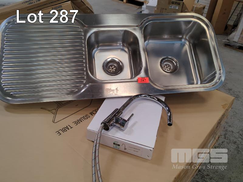 SINK & MIXER COMBO. DOUBLE BASIN STAINLESS STEEL SINK AND CHROME SINGLE LEVER SINK MIXER TAP, CURVED SPOUT. ALL NEW.