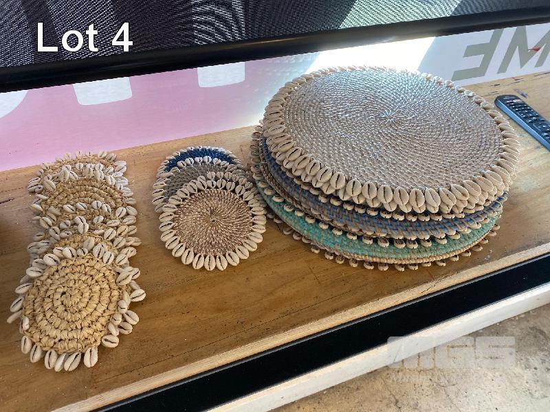 QUANTITY ASSORTED SMALL BOWLS, COCONUT & PORCELAINE, PLUS WOVEN SEA SHELL COASTERS, WOODEN SPOONS